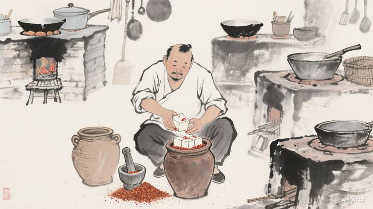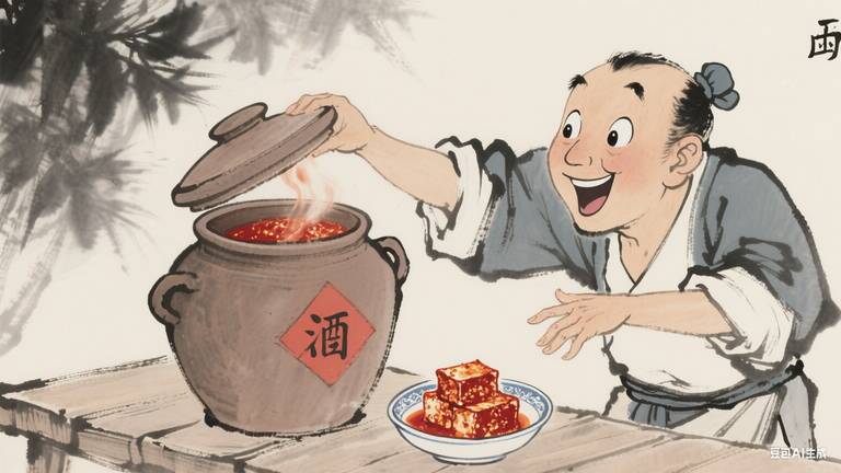 一段时间后,小贩打开陶罐,发现豆腐变成了豆腐乳。